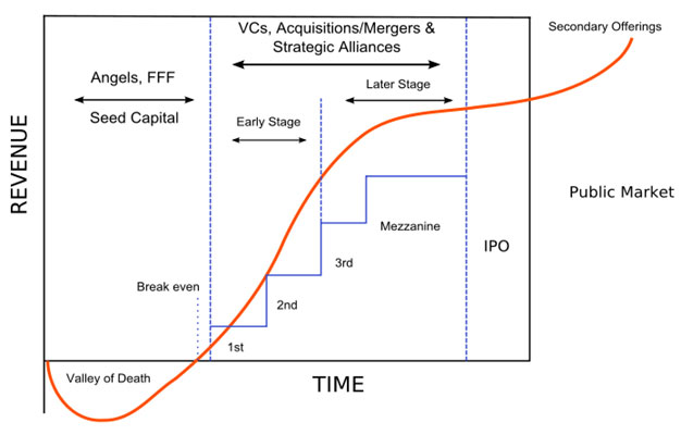 1. There are four different stages of fundraising – Seed Capital, Early Stage, Later Stage, IPO – a company grows through, each with different types of fundraising and financing options.