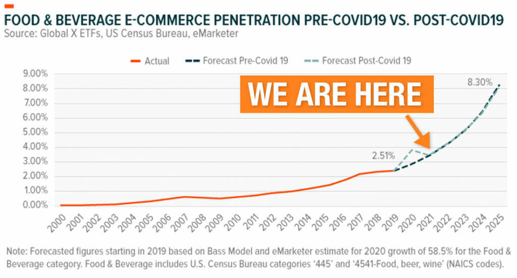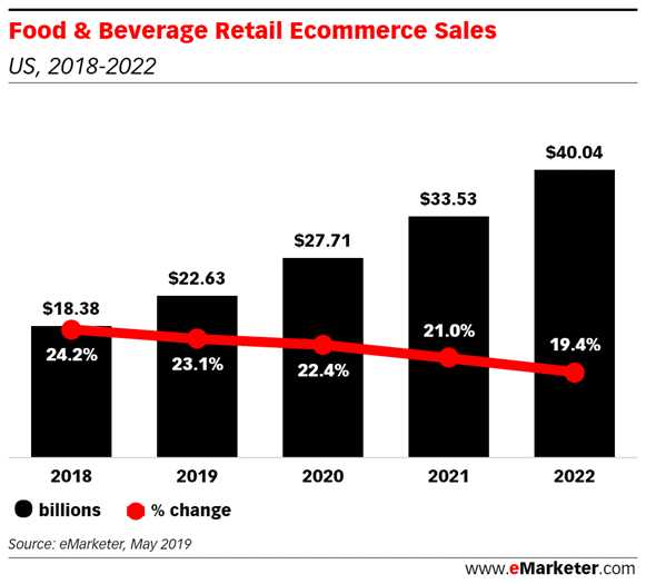 Industry wide, in 2019, food and beverage ecommerce retail sales were growing at over 23% per year and were projected to surpass $40 billion by 2022.
