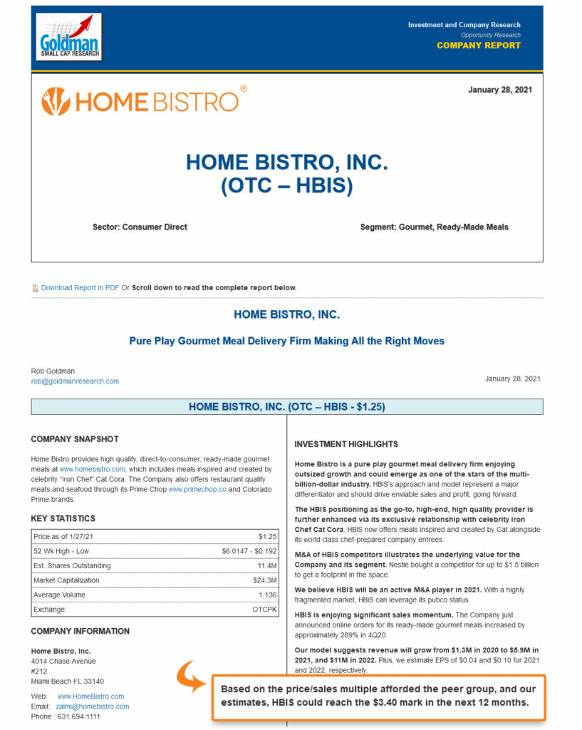After announcing their first partnerships with Celebrity Chef Cat Cora, Home Bistro’s online orders have more than doubled. In 2020-Q4 online orders were up 289% over the same period a year before, and 2021-Q1 was up approximately 198% vs 2020Q1.