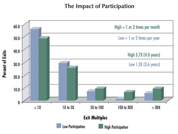 - Participation: Investors that interacted with their portfolio companies at least a couple of times per month by mentoring, coaching, providing leads, and/or monitoring performance experienced greater returns.