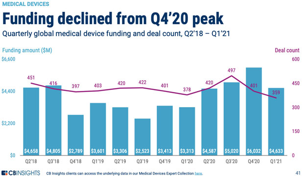 Although we saw a dip in funding activity in 2021-Q1, industry execs are optimistic about the return of non-COVID related procedures – which will likely drive the medical device market into 2021 and beyond.