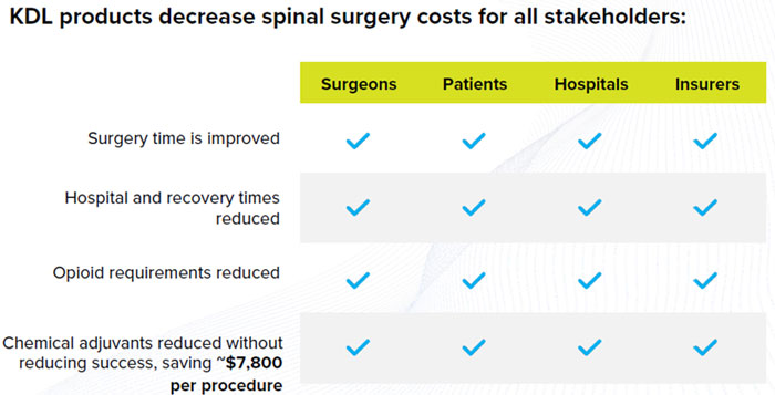 Here’s the cynical truth about the “Big Spine” industry. Innovation is not their focus – keeping the business growing and the dollars pouring in is. Their model is “innovation by acquisition,” making Kleiner Device Labs a ripe acquisition target. In the past few years, we’ve seen acquisitions ranging from almost $500 million to over $1.5 billion in this space.