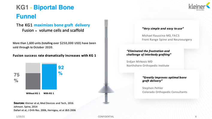 Kleiner Device Labs’ first invention – the KG1 – has already seen spinal fusion success rates increase from 75% to 92%. The KG1 has achieved Class II FDA clearance and is commercially available and sold in the US and OUS.