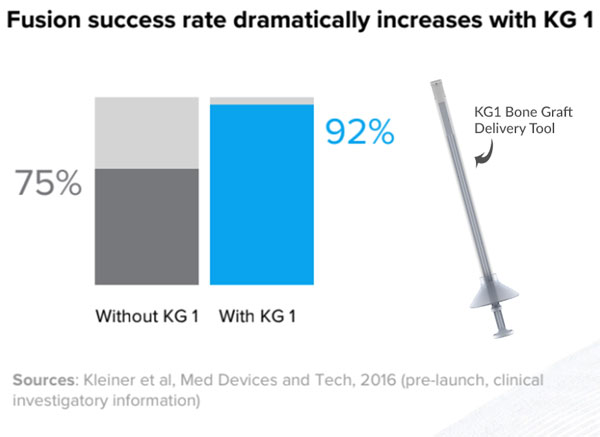 The company’s first KG1 product has already been shown to increase the rate of successful spinal fusion from a “C-grade” 75% to a “solid-A” 92%. Its upcoming KG2 has the potential to take this a step further by making the entire surgery quicker, easier, and even safer.