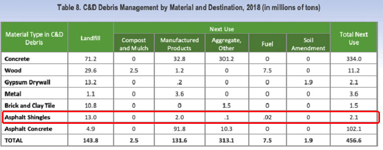 For every 1,000 tons of asphalt shingles diverted or removed, 605 cubic yards of landfill space is saved