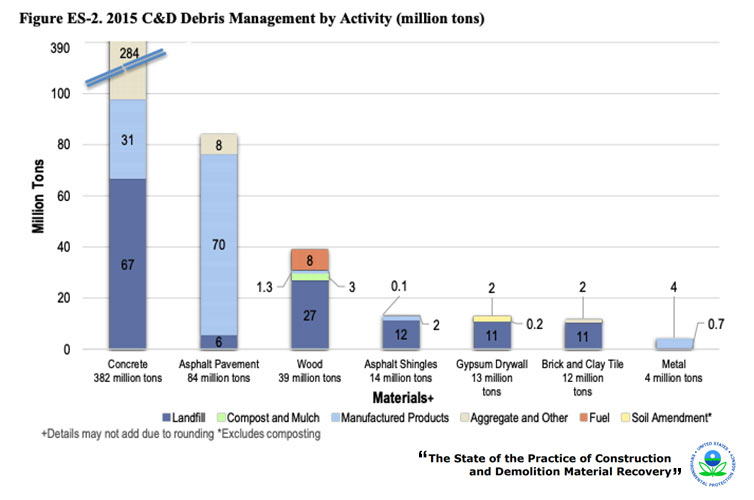 Of the more than 600 million tons of C&D debris produced each year, concrete and asphalt pavement are the largest sources of debris, making up 426 million (or 71% of the total).